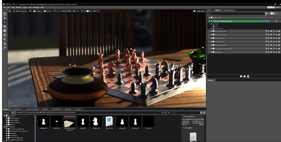 舞台に照明を調整し、小道具を配置するように、複数のUSDアセット(素材)を組み合わせて、複雑なデジタルツインの世界をレイアウトすることができます。