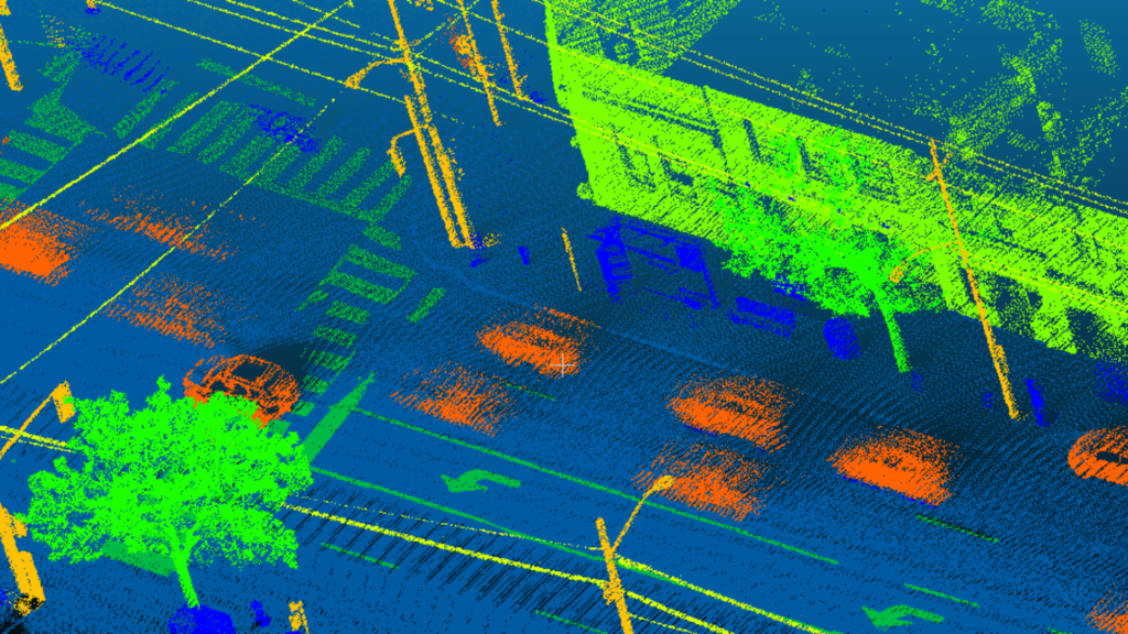 例えば、自動運転車が走行中に得られる点群から歩行者と車と信号を適切に識別し、安全に自律走行することができます。