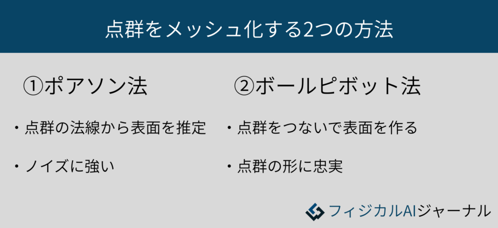 点群データをメッシュ化する際、用途やデータの状態に合わせて最適なアルゴリズムを選ぶことが重要です。ここでは、現在最も主流となっている「ポアソン法」と「ボールピボット法」の2つを詳しく紹介します。