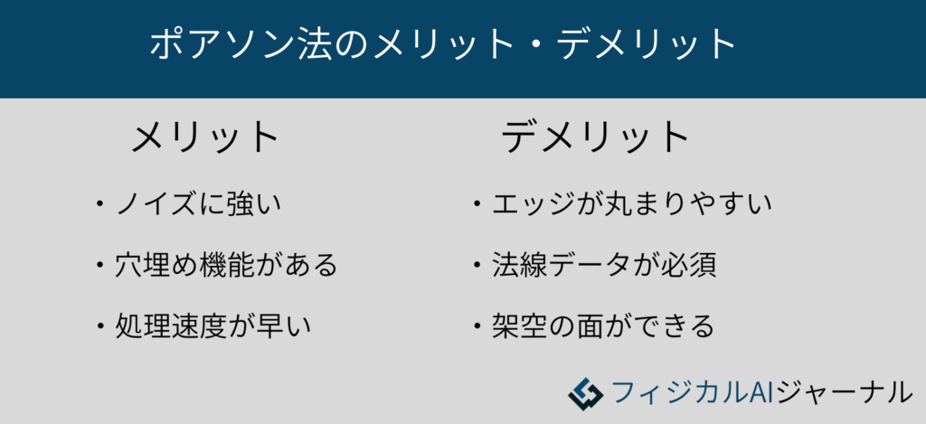 - デメリット: 生成する過程で計算コストがかかり、元の点群の形状が失われる場合もある